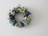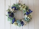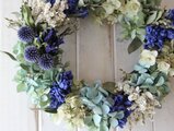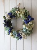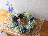 紫陽花とブルーの花をアクセントにしたリースを作りました。