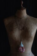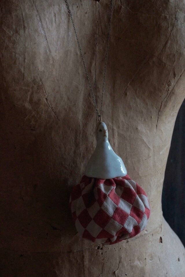 「Pörtrait」#21 / CHECKS. OPERA LENGTH NECKLACE OF TWO WHITE GLAZED HARF PORCELAIN WITH OLD CLOTH. 布と陶磁器のオペラレングス・ネックレス
