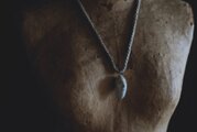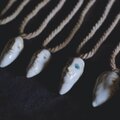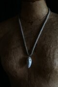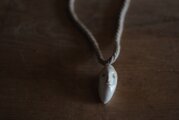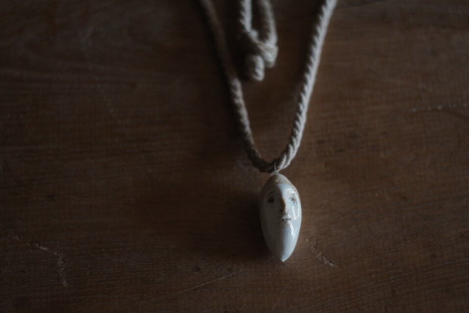 ひんやりとした灰白の半磁器に鉱物や鉄で顔を描き、上からかけた2種の白い釉薬が融け合う。