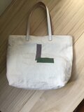 ホワイトのリネン帆布にコラージュと刺し子を刺しましたバッグです。