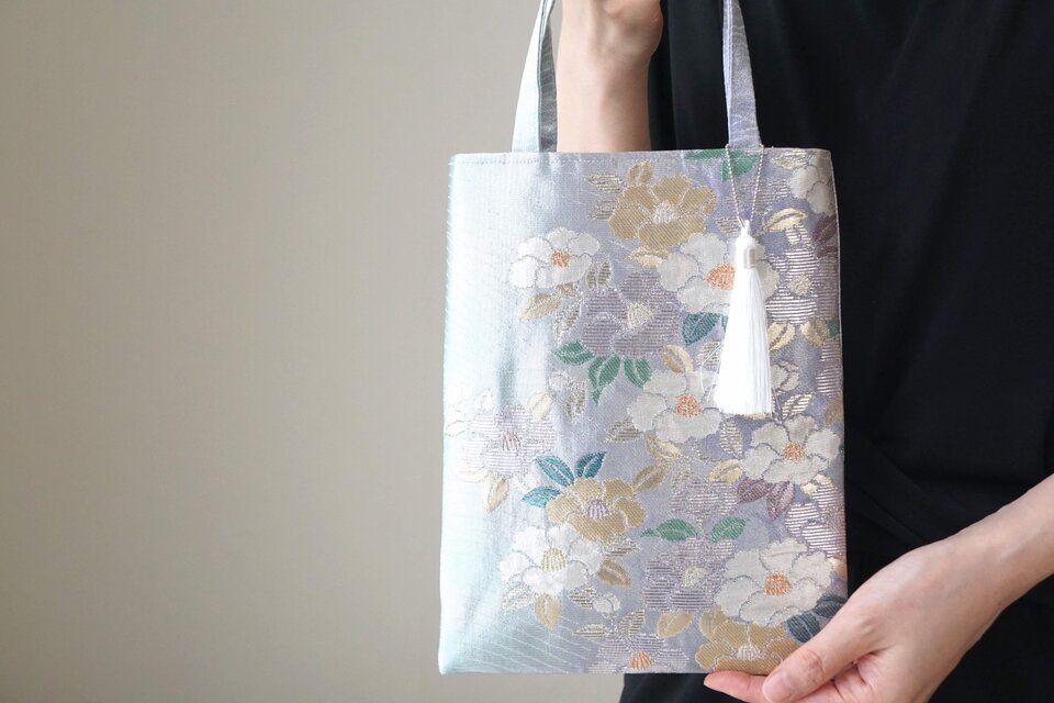 波と椿模様が爽やかな印象のシルク帯を使ったミニサブバックです。
