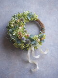 瀬戸内で育ったアナベルを空気を含ませて ふんわりと紡ぎ、爽やかなユーカリや落ち着いた色味の草花を添え、ヒノキの板を薄く削ったものを流し、優しくて涼しげなハーフリースに仕立てました。