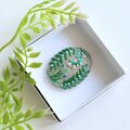 サーモンピンクの地に黒い花の刺繍、ありそうでなかったこの色のとりあわせ、すてきなブローチでした。