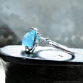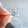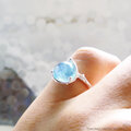 爽やかなブルーを唐草と透かし模様の細身のリングにセットしました。