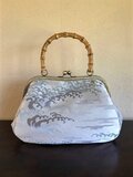 シルバーの地に波柄の模様の帯地を、竹の手がま口手提げにしました。