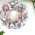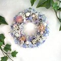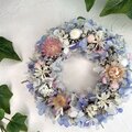 ドライの花材にライトブルーのアナベルが涼しげな夏に飾っていただきたいリースです。