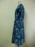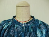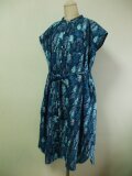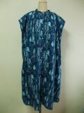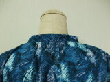 青紺色地×木柄プリント 綿麻素材 スタンドカラーフレンチスリーブシャツワンピース L~LLサイズ 受注生産