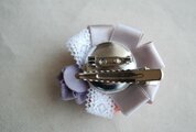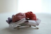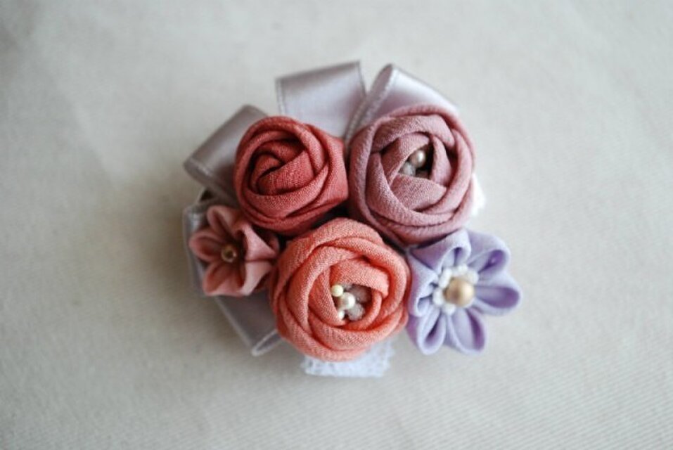 3色の玉バラと、サテンリボンとレースのコサージュです。