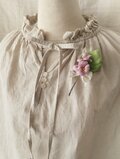 ピンクのスミレ3輪と葉をまとめて、白の小さなくしゅくしゅリボンをつけたコサージュ。