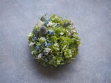 瀬戸内で育ったアナベルを空気を含ませて ふんわりと紡ぎ、優しくて爽やかな色味の草花を添え、コロンとして可愛らしいミニリースに仕立てました。