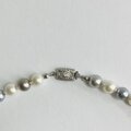 こちらはガラス素材の原玉に、オリジナルパール塗料にて何層にも渡り重ね塗りを施した日本製ガラスパールを使用しております。パール間には1つづつ丁寧に結び目を加えたオールノット仕様にしました。複数の異なるカラーのガラスパールをランダムに通したシンプルなネックレスになっております。パールサイズは8mm玉で、長さは標準的なプリンセスサイズのやや長めになる全長約45cmとなっております。パールカラーはきめ細かい質感と程良く上品なツヤ感が特徴のブルーグレー色・薄クリーム色パールをランダムに使用。ちょっとしたお出かけや普段使いにも気軽にお使い頂けます。