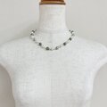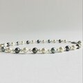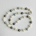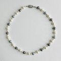 こちらはガラス素材の原玉に、オリジナルパール塗料にて何層にも渡り重ね塗りを施した日本製ガラスパールを使用しております。パール間には1つづつ丁寧に結び目を加えたオールノット仕様にしました。複数の異なるカラーのガラスパールをランダムに通したシンプルなネックレスになっております。パールサイズは4mmと8mm玉を使用して、長さは標準的なプリンセスサイズのやや長めになる全長約45cmとなっております。パールカラーは、きめ細かい質感と程良く上品なツヤ感が特徴のホワイト・パウダーブルー色・干渉色が個性的な2色のピーコックカラーをmixしております。ちょっとしたお出かけや普段使いにも気軽にお使い頂けます。
