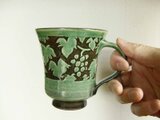 カップ全体に白い化粧泥を掛け、葡萄を描いてから余分な化粧泥は削り落として図柄だけを残しています。