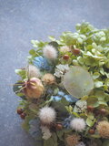 瀬戸内で育ったアナベルを空気を含ませて ふんわりと紡ぎ、爽やかで優しい色味の草花を散りばめ、コロンと可愛らしいミニリースに仕立てました。