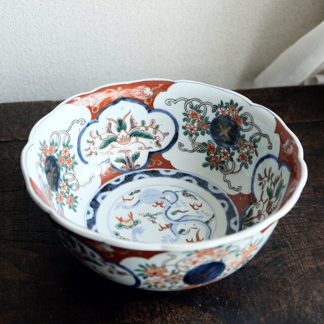 花と龍◆赤で素敵。伊万里 花文赤絵金彩波縁深鉢 antiques 骨董品 幕末〜明治期