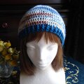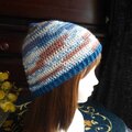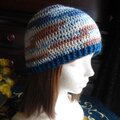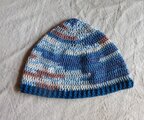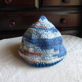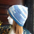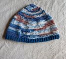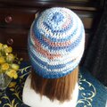 段染のコットン糸(アクリル混合)のような夏糸でで長編みでざっくり編んだ帽子です。