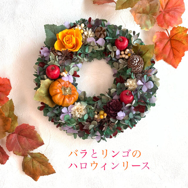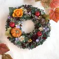 オレンジのバラとカボチャ・黒猫などはっきりとした色合いのそして大人可愛いリースです。