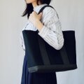 持ち手部分は丸持ち手にしており、長時間の持ち運びでも手にフィットしやすくなっています。ビジネスシーンだけでなく、プライベートでも活躍する、デザインも使いやすさも追求した、トートバッグです。