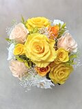 大輪の黄色とパステルオレンジの薔薇がメインでボリューム感があります。