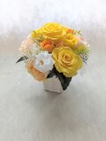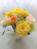 白い花器にプリザーブドフラワーの黄色、オレンジ、白の薔薇と小花やグリーンを使用したナチュラル感のある明るく軽やかなアレンジです。