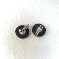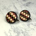 市松寄木を円形にカットして同じく円形のアフリカン・ブラックウッドの薄い台木の上に固定しました。全体の角をとって丁寧に研磨しています。のイヤリング金具はエポキシ系樹脂で固定しています。金具以外全て木でできていますので、とても軽いピアスです。
