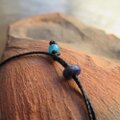 二本の紐をまとめるビーズ、紐の先端のビーズ共に、インドパシフィックビーズを使用しています。