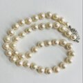 オールノットネックレスの特徴として、万が一糸が切れた場合でも被害は最小限で抑えられる点や、玉同士が密着していないので擦れあいにくく傷も付きにくい点・また首回りにフィットしやすくなっている点等がございます。この仕様は特に海外で人気があり、比較的高品質アクセサリー類によくみられる仕様です。※日本製人工真珠となっております。パール核には、原玉の成型時よりピンホールや小さい凹み等が稀に見られる場合がございますが、検品をした上、品質には問題無く許容範囲とさせて頂いております。予めご了承くださいませ。