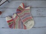 足部分はと段染めの2色でJogless stripeというストライプの技法で編み足にフィットするようにマチを入れでます。