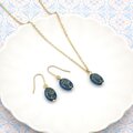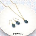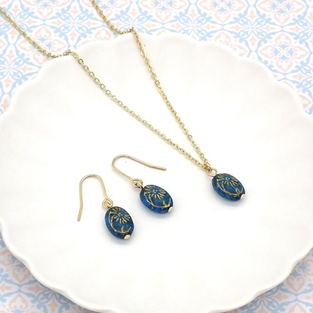 ゴールドのフラワーモチーフが施されたアンティークな雰囲気のオーバル形のチェコビーズのネックレスとピアス/イヤリングのセットです。