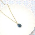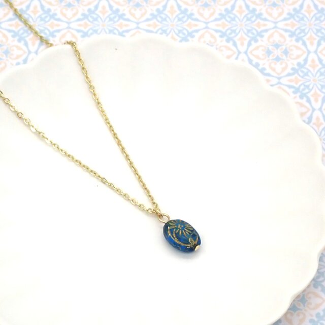 ゴールドのフラワーモチーフが施されたアンティークな雰囲気のオーバル形のチェコビーズのネックレスです。