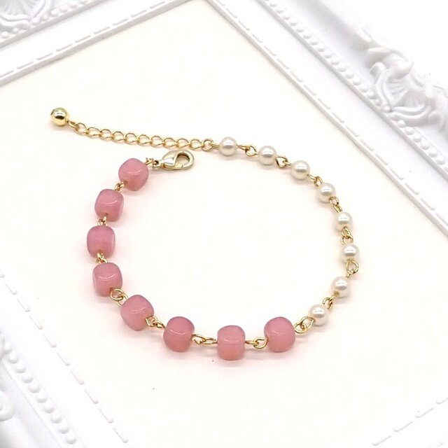 オパールピンクのキューブ型のチェコビーズと小さなパールの大人可愛いブレスレットです。