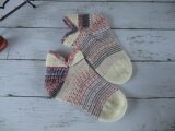 足部分はと段染めの2色でJogless stripeというストライプの技法で編み足にフィットするようにマチを入れでます。