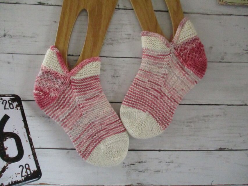 ドイツのブランド Opal Cotton Premium KFS 216 ルビー&KFS 207 コットンホワイトと名前のついている糸で編んだ chiharu.amukoのIDでインスタグラムで活動されている方のレシピで編んだコットンソックスです。