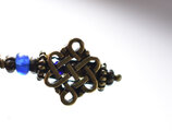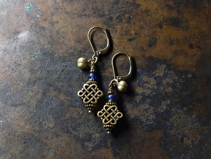 エンドレスノットとブルーアンティークビーズ、民族鈴のピアス