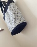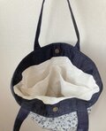 素材は丈夫なコットンリネンキャンバスとデニム生地を使用しております。さらにバッグ全体に接着芯を使用していますので、しっかりとした仕上がりです。