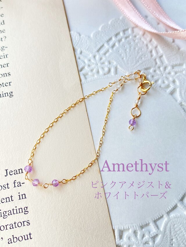 14kgf 宝石質ピンクアメジストとホワイトトパーズの華奢ブレスレット /ac802