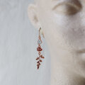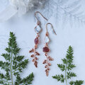 零れ落ちる天然石の雫から葉っぱが生い茂るようなピアス。マットな白地にグレーの網目が入るハウライトと、透明の中に赤い内包物が浮かぶエピドート、葉っぱはツルシノブという植物です。