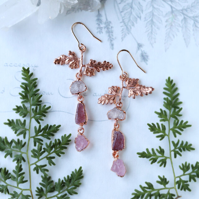 原石ローズクォーツと葉っぱピアス