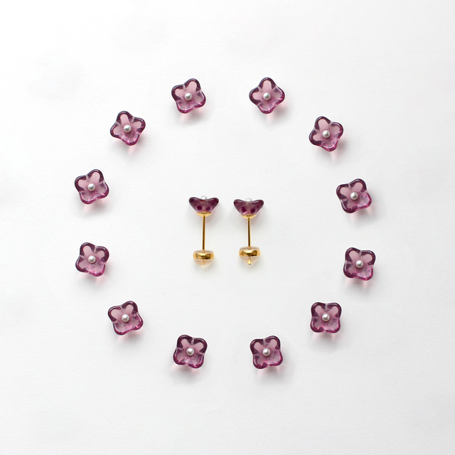 ヴィンテージガラスとパール|小さな花のピアス/ノンホールピアス[クリアパープル] pag046