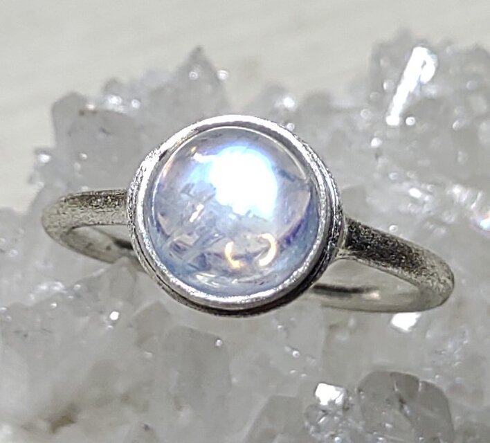 眩いほどの青白いシラーが現れる綺麗なレインボームーンストーン(ラブラドライト)のシルバーリング*特有のクラックもありますが明瞭なシラーをお楽しみ下さい*リングはアンティーク調の二重ベゼルとマット仕上げ、8~18(推奨サイズ)の範囲を目安に調整可能、サイズ確定後にマットな覆輪で石留め致します*通常、黒化遅延処理を施しますが銀そのものの変化をお好みの場合は処理不要とお申し付けください*黒化防止ロジウム(最終画像下段色味参照)など各種コーティングをご希望の場合は承ります(オプション1000円)