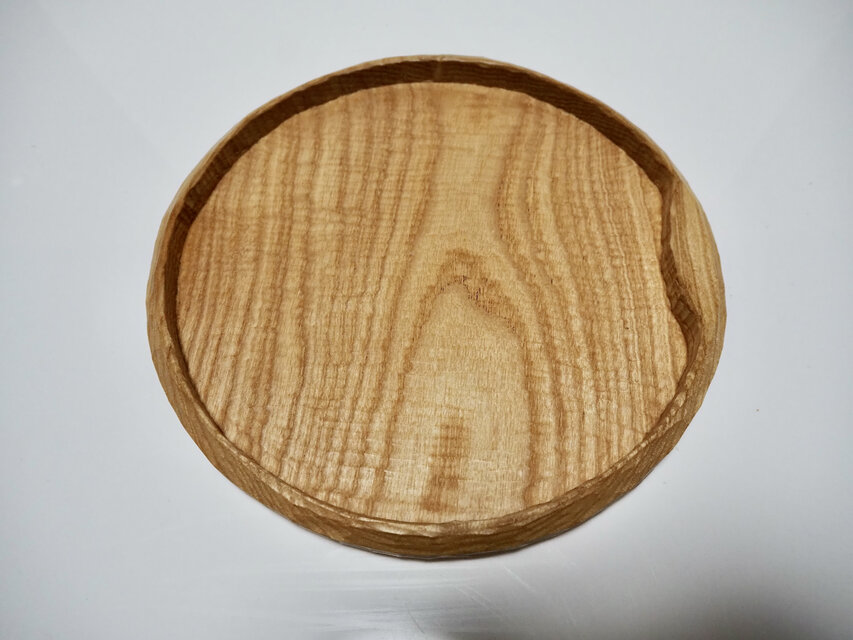 堅牢なトネリコを使用したの22cmの手彫りの丸盆。