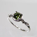 シックなグリーンの小さなモルダバイトを、唐草と透かし模様の細身のリングにセットしました。