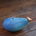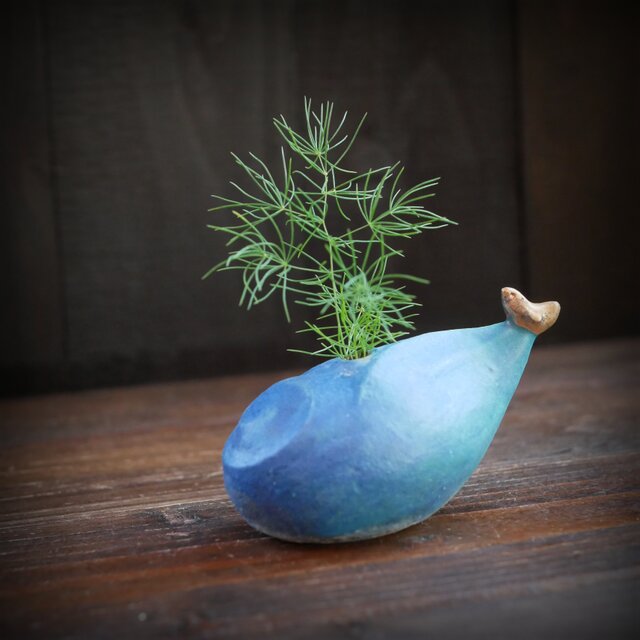 締めて閉じ小さな穴を開けます。風のラインを指で即興になぞらえ、青色の濃淡をグラデーションに彩色しました。先端にとまった金色の小鳥が得意げです。出来上がりの形を特に決めずに進めるので、作っていてとても開放的な気分でした。草花や葉っぱをお気軽に挿してお楽しみ下さい。
