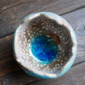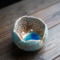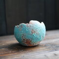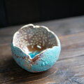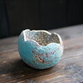 手びねり成形した何かの殻の様な器です。外側は荒々しく風化した様なテクスチャーです。中を覗くと安心して魚が遊ぶ小さな森の世界が静かに息づいています。草花を活けたり小物を入れたり、又はそのまま時折覗き込んだり等ご自由にお楽しみ下さい。