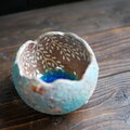 手びねり成形した何かの殻の様な器です。外側は荒々しく風化した様なテクスチャーです。中を覗くと安心して魚が遊ぶ小さな森の世界が静かに息づいています。草花を活けたり小物を入れたり、又はそのまま時折覗き込んだり等ご自由にお楽しみ下さい。