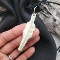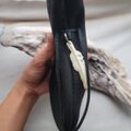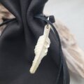 チャームは風切羽(かざきりばね)をモチーフに鹿の角から削り出しました。