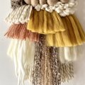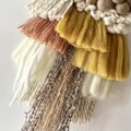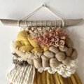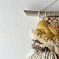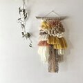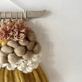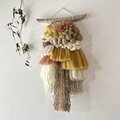 黄金色やブラウン、ベージュ等を組み合せ、落ち着いた中にも可愛さのあるタペストリーに仕上げました。