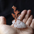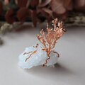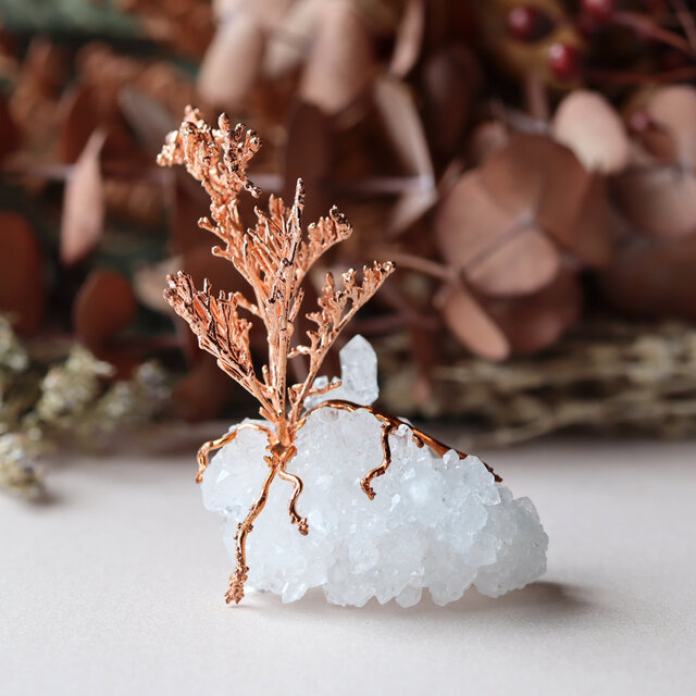 鉛筆型に育つ結晶が集まりきらきらと輝くクォーツクラスターと、鉱物を抱え込むように根を張り、繊細な枝分かれの先に無数の小さな花を咲かせるスターチス・カスピアの樹。自然造形の美しさを楽しめる、手乗りサイズのオブジェです。