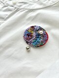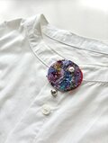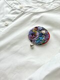 赤、紫、ピンク、青、黄色、ゴールド、みどり色、白、とたくさんの色が少しずつ、ブローチの中央から縁まで散りばめてある、にぎやかなブローチです。