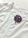 中央から上の方にはコットンパールがやさしい艶を持つパールを一粒置きました。その下には青みがかった紫色のスパンコールは光の加減で輝くので距離があってもきらっと目が留まる部分です。